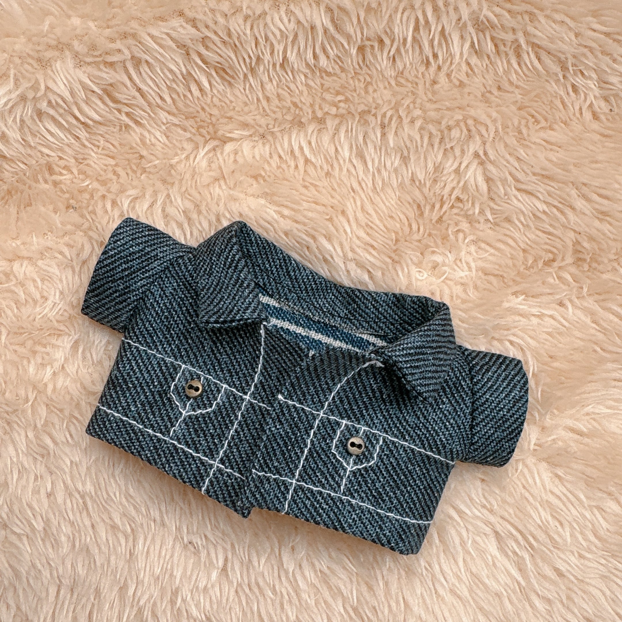 柔らかなニットフードと、デニム風のジャケットを組み合わせたぬい服です。